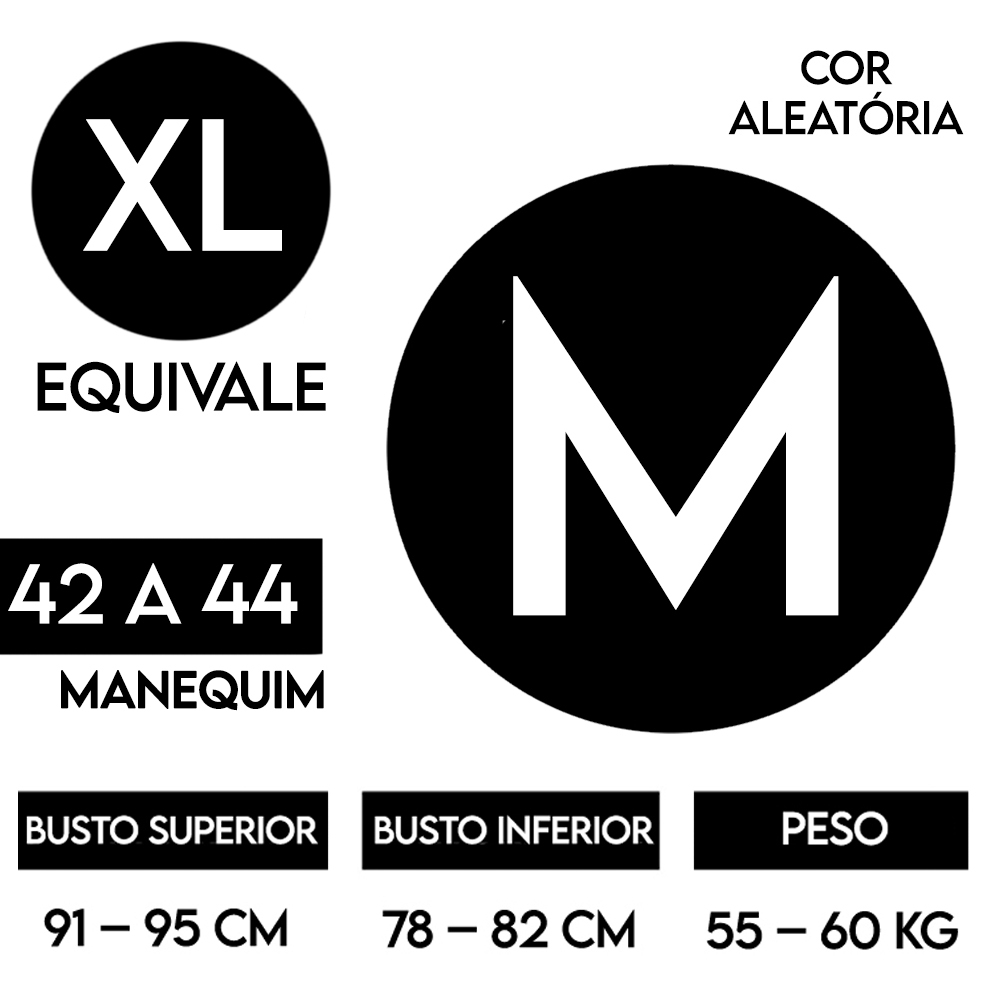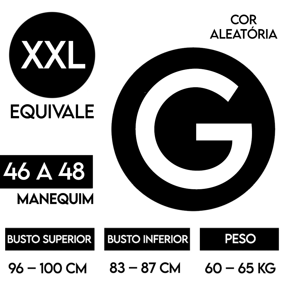• GG: Busto Superior: 91 a 95 cm | Busto Inferior: 78 a 82 cm | Peso: 55kg - 60kg